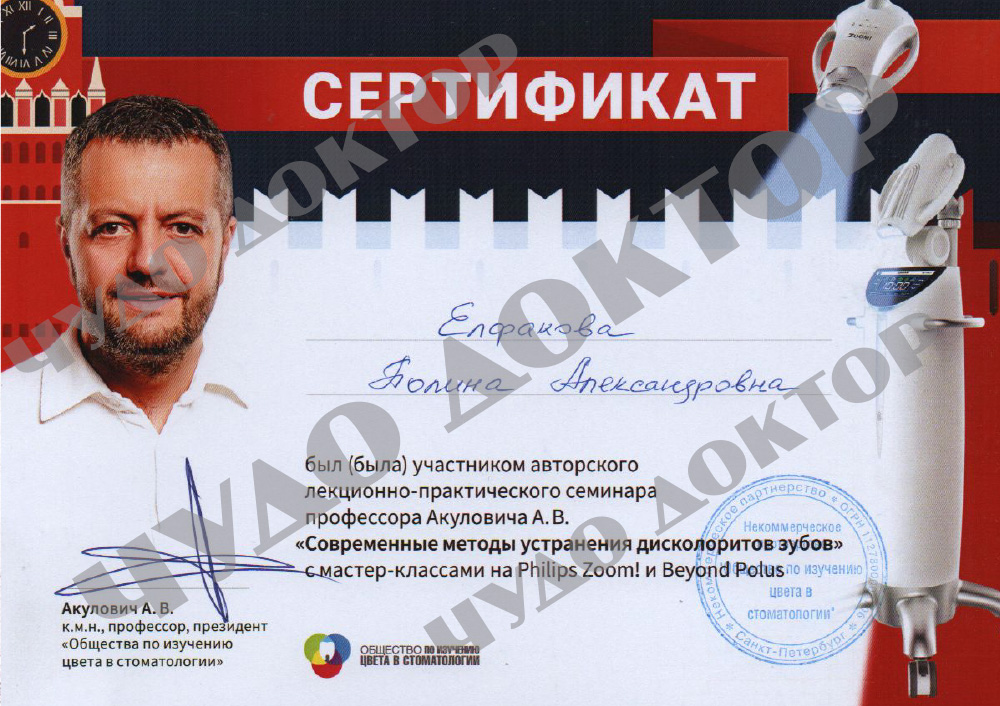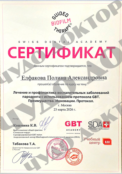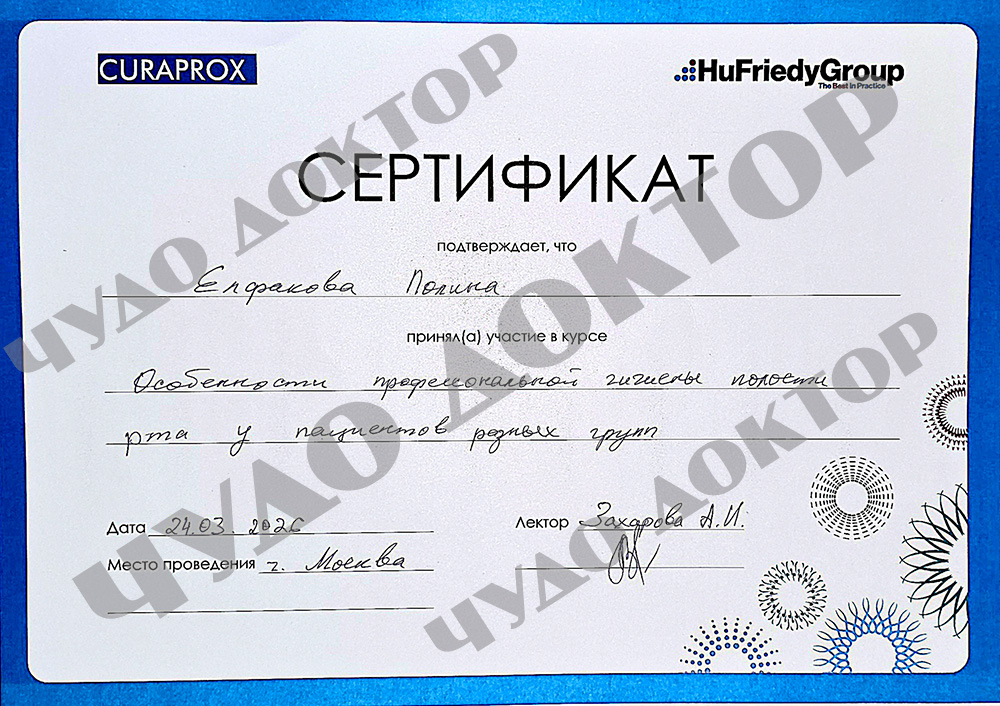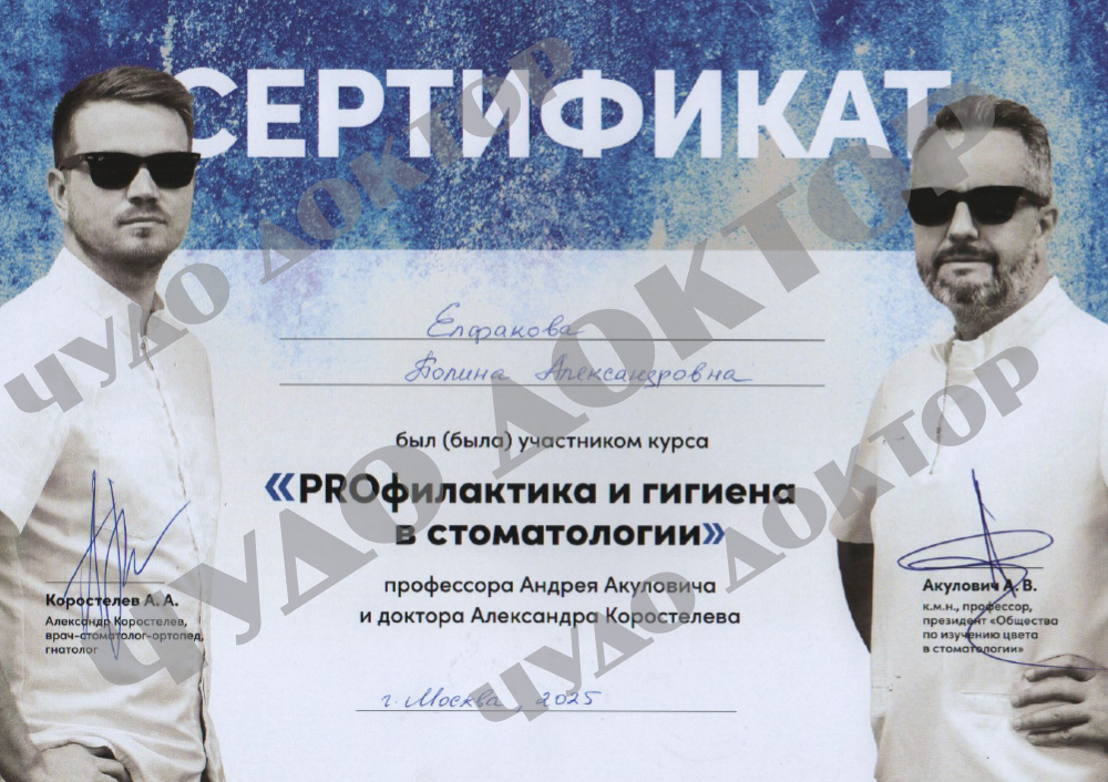 2025 г. – Стоматолог гигиенист, Первый МГМУ имени И.М. Сеченова, Институт стоматологии имени Е.В. Боровского